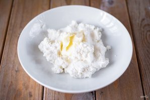 Приготовьте творожную начинку. В миску выложите весь творог, добавьте мягкое сливочное масло (20 грамм), соль. Вилкой все перемешайте.