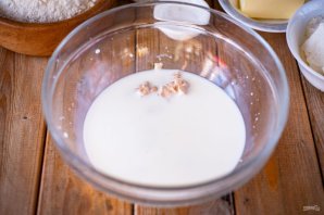 В просторную миску залейте молоко, разотрите руками дрожжи, добавьте сахар. Венчиком активно перемешайте эти ингредиенты до полного растворения дрожжей.