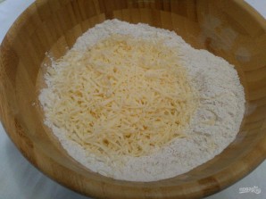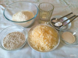 Подготовьте всё необходимое: муку предварительно просейте, сыр (голландский, российский, гауда и др.) натрите на мелкой тёрке.
