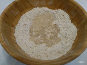 Сделав углубление в полученной массе, влейте тёплую (температура — 30-35 градусов) воду и замесите тесто. Оно получается довольно плотным.