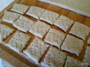 Обомните тесто руками, раскатайте его в пласт толщиной 5-6 мм, а затем разрежьте на небольшие прямоугольные кусочки и проколите их вилкой в нескольких местах.