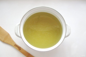 Отварное мясо достаньте из кастрюли, а бульон процедите. Желатин замочите в холодной кипяченой воде на 10-15 минут. После выложите в горячий бульон и перемешайте до полного растворения.