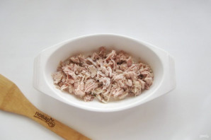 Отварную курицу с индейкой обработайте, удаляя кости и шкурку. Должно остаться только мясо. Нарежьте его и разложите по тарелкам.