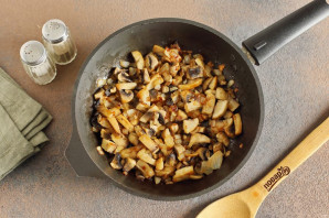 Дадайце нарэзаныя кубікамі грыбы і прыгатуйце ўсё разам яшчэ каля 5 хвілін.