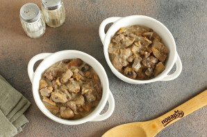 Рэцэпт не забярэ дакладна шмат часу. Гэта страва можа быць прыгатавана не толькі з пячонкай, але і з часткай курочкі і такім жа колькасцю курыных сэрцаў. У любым выпадку гэты выдатны жульен упрыгожыць нават любы святочны стол. Калі вы любіце пячонку, абавязкова паспрабуйце! Страва сачнае, няжнае і вельмі смачнае! Грыбы можна ўзяць любыя, ў мяне шампінённы. Падавайце гарачым.
