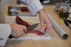 Говяжью вырезку вымойте и промокните бумажными салфетками, чтобы мясо было сухим. При необходимости зачистите мясо от ненужных пленок и жилок. Нарежьте его на тонкие ломтики поперек волокон очень острым ножом.