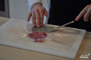 Кусочки мяса оберните пищевой пленкой или же просто поместите в файлик формата А4. Отбейте говяжью вырезку лопаткой до полупрозрачного состояния. Благодаря пищевой пленке мясо останется целым и не разлезется.