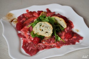Возьмите большое блюдо, на которые вы будете выкладывать карпаччо. Смажьте его дно бальзамическим кремом. Выложите на тарелочку мясо, полейте соусом. Затем выложите на кусочки говядины немного малины, рукколу и соус "Песто".
