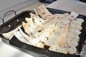 Багет надо заморозить, а потом очень тонко нарезать, выложить на противень и отправить подсушиваться в духовку на 25 минут при 120 С. То же самое я проделываю и с лавашом.