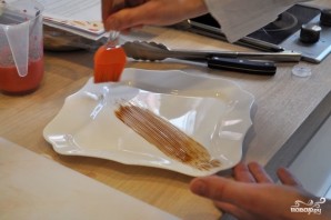Приступаем к сервировке: бальзамическим кремом сделайте полосу на тарелке кисточкой. Затем выложите на нее мясо.