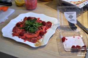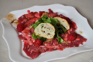 Закуска готовится быстро и просто. Для приготовления карпаччо из мраморной говядины обязательно надо взять отборное мясо, не старую, а молодую говядину. Существует много рецептов карпаччо, но вариант с малиново-лимонным соусом мне нравится больше всего. Попробуйте и вы Подавайте закуску к столу.