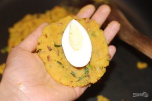 3. З фаршаванай масы зрабіце пляцок, памесціце ўнутрэй палову яйка.