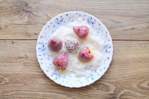 Абваляйце ягады ў какосавай цюценьні, выкладзіце на талерку так, каб яны не дакраналіся адна да адной. Пастаўце цукеркі ў марозільную камеру на 15 хвілін, каб цюценьня зліплася і добра трымалася. Пасля гэтага падавайце да стала.