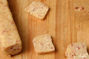 2. Выложить тесто на большой лист пергаментной или вощеной бумаги. Скатать тесто в длинный прямоугольник диаметром 2,5 см. Завернуть в бумагу и заморозить в течение минимум 3 часов. Разогреть духовку до 200 градусов. Выстелить противень пергаментной бумагой или силиконовым ковриком. Нарезать тесто на ломтики толщиной около 6 мм
