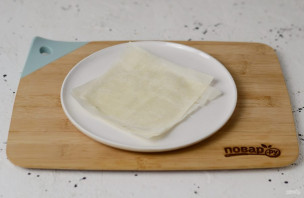 Тесто фило разрежьте на квадратики подходящего размера. На одну корзиночку потребуется 3-4 слоя. Промажьте каждый растительным маслом и сложите вместе.