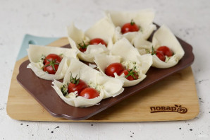 Помидоры черри разрежьте пополам, выложите в корзиночки, слегка надавив. Выпекайте 20-25 минут в заранее разогретой до 175 градусов духовке.