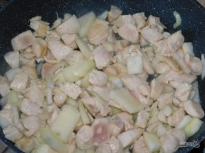 Курынскае філе нарэжце і падсмажце разам з луком.
