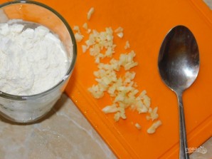 Муку растворыце ў вадзе, дадайце падробленьны часнык і ўлійце ў скавародку. Дадайце соль і спецыі паводле смаку. Перамяшайце і тушице на невялікім агні прыкладна 15 хвілін.