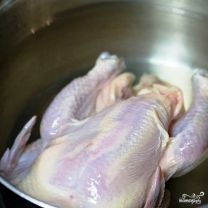 Заліваем курыцу халоднай вадой, ставім на моцны агонь, дакіпячаем, пасля чаго памяншаем агонь і варым да мяккасці курыцы (у суме — каля 40 хвілін).