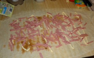 Лаваш раскладываем на столе и слегка смазываем майонезом. Сверху выкладываем порезанную ломтиками ветчину.