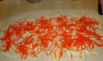 Затем кладем следующий лаваш, также смазываем его майонезом и раскладываем морковь по-корейски.