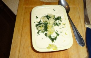 Плавленный сыр смешайте с измельченной зеленью и чесноком, пропущенным через пресс.