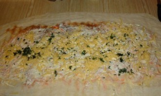 Полученную массу наносим на следующий лаваш. Также добавляем тертый сыр и зелень.