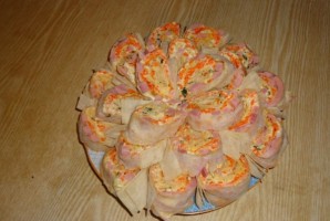 Закуска готовится быстро и просто. Перед вами - простой рецепт приготовления лаваша с корейской морковкой и ветчиной. Начинку для закуски можно смело изменять, добавляя новые ингредиенты. Перед подачей на стол лучше всего поставить блюдо в холодильник для пропитки. Удачи Закуска готова. Подавайте сразу.