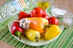 Подготовьте продукты по списку для приготовления лечо из перца и помидоров с чесноком.