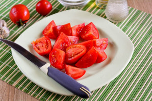 Помидоры промойте и нарежьте дольками, удалив плодоножку.