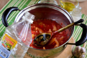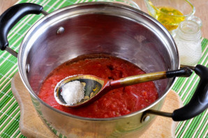 Варите помидорный соус с добавлением сахара, соли и растительного масла. Варите 5-7 минут.