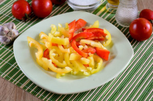 Почистите сладкий перец от семян и хвостиков, нарежьте полосками.