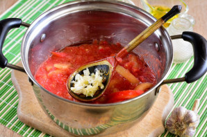 Варите лечо 15 минут, в конце выдавите зубчики чеснока через пресс.