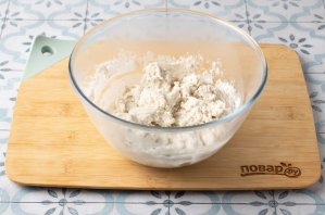 Получившуюся смесь добавьте в миску с горячей водой. Замесите однородное, чуть липкое тесто. Муку при необходимости можно подсыпать.