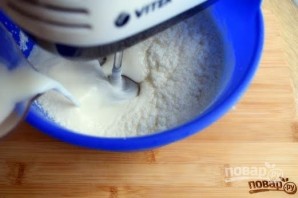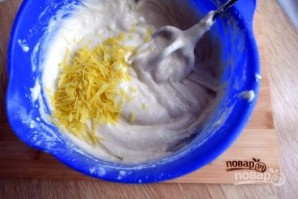 5. Введите муку и разрыхлитель, перемешайте. Измельчите цедру с лимона, добавьте ее и лимонный сок в тесто.