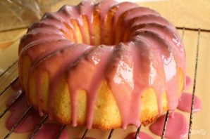 8. Для глазури сахарную пудру соедините с соком и тщательно размешайте, чтобы не было комочков. Полейте глазурью кекс и поставьте на пергамент, запекайте в разогретой до 60 °C духовку на 10 минут. Остудите и подавайте к столу.