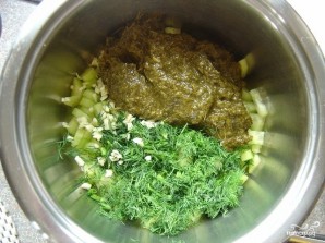 Дадаць да агуркам пасечаны часнык, кроп і шчавель.