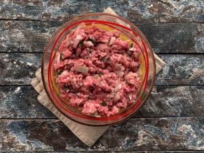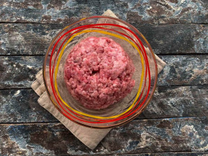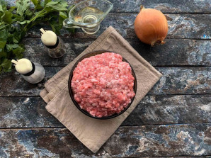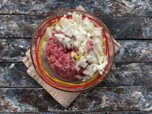 Лук пачысціце ад лушпіны, нарэжце кубікамі і дадайце да фаршу.