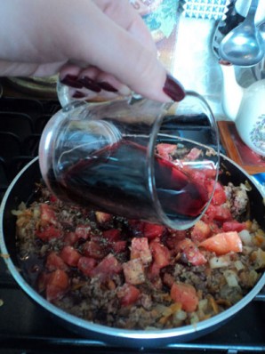 2. Дадамо фарш, падсмажым, пакуль ён не змяніць колер. Потым дадамо памідоры, таматную пасту і спецыі. Рэкамендую выкарыстоўваць арэгано і базылік. Нальём віно і тушым пад крышкай на слабым агні да гатоўнасці.