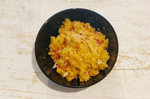 Пакуль цеста адпачывае, прыгатуйце начынку. Капусту натрыце на цёрцы разам з луком і змяшайце з мясным фаршам.