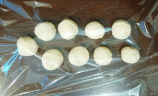 Раскачайце цеста, падзяліце на аднолькавыя кавалачкі, скатайце шарыкі. Накрыйце пленкай і дайце ім адпачыць 15 хвілін.