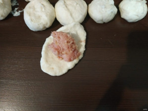 Калі калобкі падыдуць, разроўніце іх рукамі ў кружочкі і пакладзіце ў цэнтр па лыжцы начынкі. Зашчыпіце манты, як пірогі.