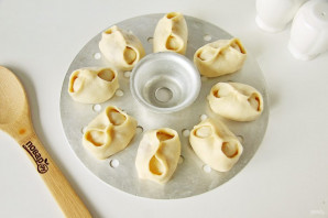 Мукі можа пайсці крыху больш або менш, чым указаны ў рэцэпце. Гатованае цеста павінна быць як на пельмені — даволі шчыльнае, пругкае і зусім не прыліпаць да рук. Накрыйце цеста чыстым рэчывам і дайце адпачыць.
