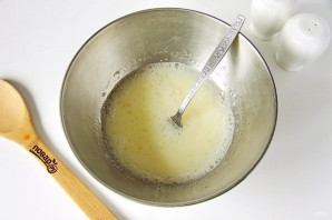 Наліце ў глыбокую міску халодную ваду, дадайце яйка, алей, 1 ч.л. солі і ўсё добра змяшайце.