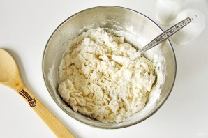 Паступова дадавайце мукі. Спачатку змяшайце ўсё вілкай, а пасля працягвайце месіць рукамі.
