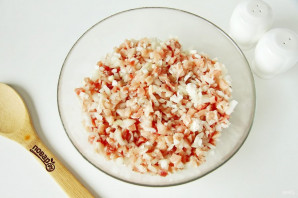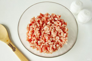 Тым часам прыгатуйце начынку. Мясо нарэжце вострым нажом на дробныя кавалачкі, чым дробней атрымаецца, тым лепш. Зручней за ўсё нарэзаць мясо, калі яно крыху падмарожанае.