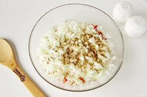 Дадайце да мяса пачынёны лук прыкладна такімі ж кубікамі. Дадайце перац, зіру і соль па смаку.