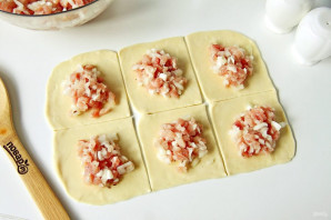 Дастаньце адпачылае цеста і адразаеце ад яго кавалак. Раскатайце яго ў прамавугольны пласт таўшчынёй каля 2 мм. Стол і скалку папярэдне змашчыце раслінным алеем ці пасыпце мукой. Потым разрэжце цеста на квадраты. Памер квадратаў залежыць ад пажаданага памеру будучых мантаў. На кожную частку пакладзіце начынку, прыкладна 1 сталовую лыжку.