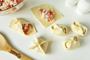 Цяпер сфармуйце манты. Для гэтага вазьміце адзін вугалак квадрата і злучыце яго з процілеглым. Такім жа чынам паступіце з астатнімі двума. Атрыманы канверт ператварыце ў манту, злучыўшы па два вуглы, якія размешчаны побач адзін з адным. Або сфармуйце манты любым іншым зручным спосабам.