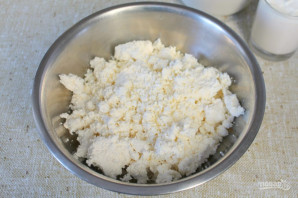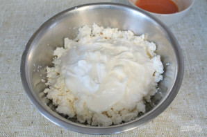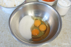 Готовим творожную массу. В миску вбиваем яйца, добавляем соль и сахар (70 гр.). Взбиваем до пены.